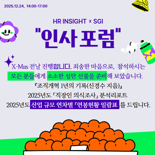 SSGIÁö¼Ó¼ºÀ忬±¸¼Ò¿Í ÀλçÀü¹® ¿ù°£Áö HR insight´Â ÀλçÀÇ °¢Á¾ °úÁ¦¸¦ ´Ù·ç´Â ÀλçÆ÷·³À» °øµ¿ ÁøÇàÇϰí ÀÖ½À´Ï´Ù. 1ºÎ µ¥ÀÌÅͱâ¹ÝÀÇ Á¶Á÷°úÁ¦ ¿¹Ãøº¸°í¼ÀÇ ¹ßÇ¥, 2ºÎ ÇöÀå»ç·Ê°øÀ¯(LGÀ̳ëÅØ, ¿ì¹Ì°Ç¼³)ÀÇ ¼ø¼·Î ÁøÇàµÇ´Â 7ȸ Æ÷·³¿¡ °ü°èÀÚ ¿©·¯ºÐÀ» ÃÊ´ëÇÕ´Ï´Ù. [Ưº°¼±¹°] °ÀÇÀå ÀÏÁ¤°ü°è·Î À̹ø Æ÷·³Àº ºÎµæÀÌ X-Mas Àü³¯ ÁøÇàÇÕ...